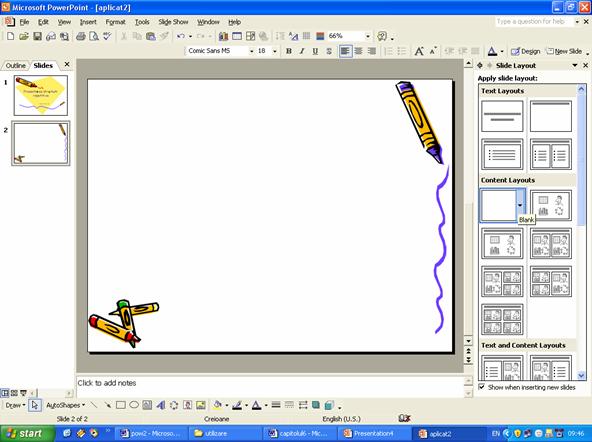 diapozitivuli inserat la lansarea aplicatiei tipul Blank. Aici se acceseaza de pe bara cu instrumente de desenat