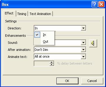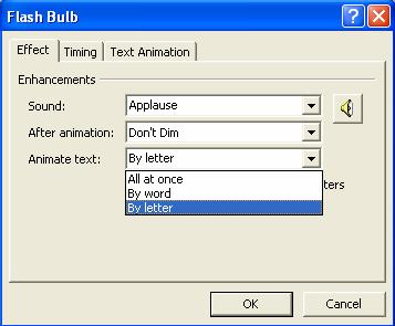 v Apoi setam acest efect astfel încât sa îi adaugam un sunet de tip Camera si sa apara imediat dupa deschiderea prezentarii. Pentru aceasta deschidem fereastra Effect Options... prezentata în figura 57. Aici setam sunetul Camera iar din foaia Timing, folosim optiunea Start si de aici alegem din lista With Previous.