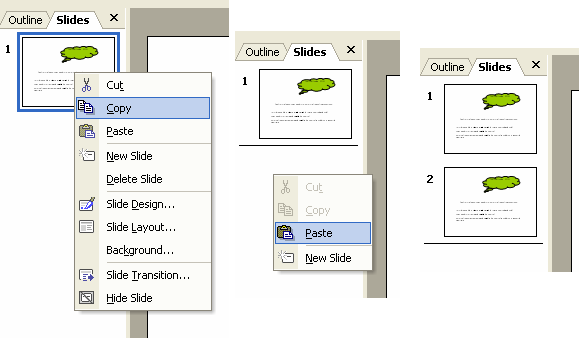 v Deoarece cel de-al doilea diapozitiv seamana cu primul putem sa realizam o copiere si o lipire, astfel încât sa ne usuram munca. Pentru aceasta dati clic dreapta pe primul diapozitiv si din meniul care apare alegeti optiunea Copy. Apoi clic dreapta într-o zona libera a panoului din partea de sus si alegeti din meniul care apare optiunea Paste, ca si în figura 72. De asemenea putem sa apasam tastele Ctrl + C atunci când este selectat diapozitivul si apoi sa apasam tastele Ctrl+V pentru a realiza inserarea;