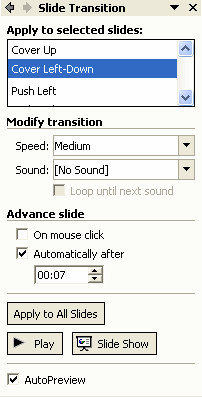 AutoPreview - seteaza vizualizarea automata a examinarii efectelor de animatie si a tranzitiilor între diapozitive la adaugarea sau modificarea unui efect.