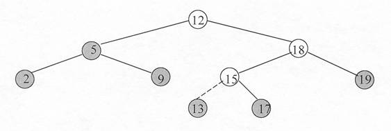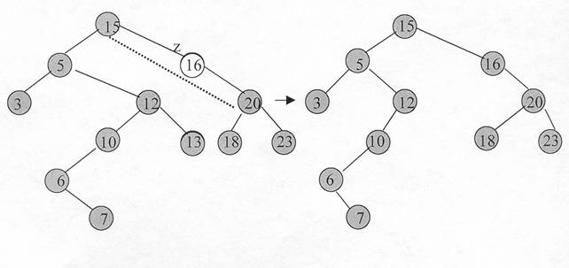 Īn aceasta figura nodurile umbrite marcheaza calea de la radacina pāna la pozitia īn care se face inserarea. Linia punctata indica legatura īn arbore care este adaugata pentru inserarea elementului. (cheia elementului care se insereaza este 13).
