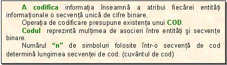 Informatia dintr-un text corespunde limbajului uman care foloseste 10 cifre ( 0,1,.,a ) 26 de litere mici, 26 de litere mari si caractere speciale. Acest ansamblu de simboluri nu poate fi inteles de catre calculator, care intelege numai sistemul binar. Informatia trebuie sa fie transformata astfel incat sa fie inteleasa de calculator, in forma binara.