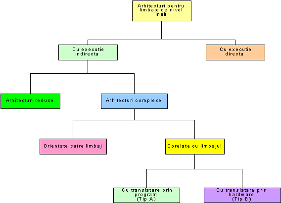 In figura 1.1 se indica o posibila clasificare a arhitecturilor [1],[2]. Principalele doua clase sint: arhitecturi cu executie directa si arhitecturi cu executie indirecta.Arhitectura cu executie indirecta se subdivizeaza in arhitectura complexa si redusa, iar arhitectura complexa include arhitectura orientata catre limbaj (language oriented) si arhitectura corelata cu limbajul (language-corresponding). In fine, arhitectura corelata cu limbajul se subdivizeaza in arhitecturi ce necesita translatari prin program si arhitecturi cu translatari prin hardware.