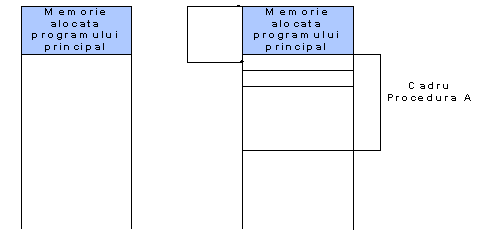 In fig. 1.2. numai zona superioara este alocata pentru a pastra variabilele i,j si a, definite in programul principal. Cind se executa instructiunea care apeleaza procedura A, alocarea memoriei se modifica (Fig. 1.2.b.).