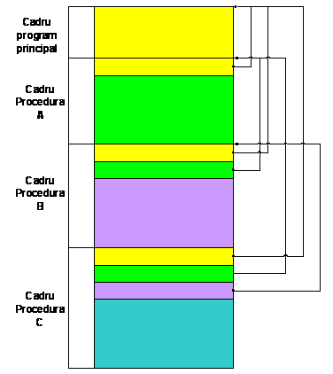 Deoarece limbajul Pascal permite programarea recursiva, fiecarei apelari de procedurri trebuie sa i se ofere propria copie de parametri si variabile definite in cadrul procedurii. In felul acesta, apelarea procedurii reduce alocarea unei noi regiuni de memorie, numita cadru (frame), care contine variabilele locale ale lui A, parametrii sai, adresa de revanire si orice alta informatie necesara adresarii variabilelor exterioare lui A, dar vizibile din procedura A. In acest exemplu celelalte variabile sint cele definite in programul principal.
