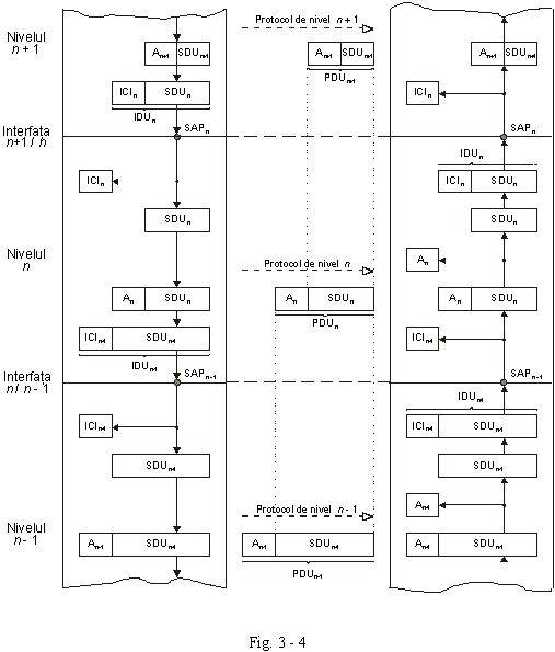 În fig. 3 - 4 sunt ilustrate trecerile mesajelor prin interfete catre nivelurile inferioare (cazul emisiei) si respectiv catre nivelurile superioare (cazul receptiei), indicându-se atasarile si înlaturarile informatiilor de control pentru interfete si pentru protocoale.