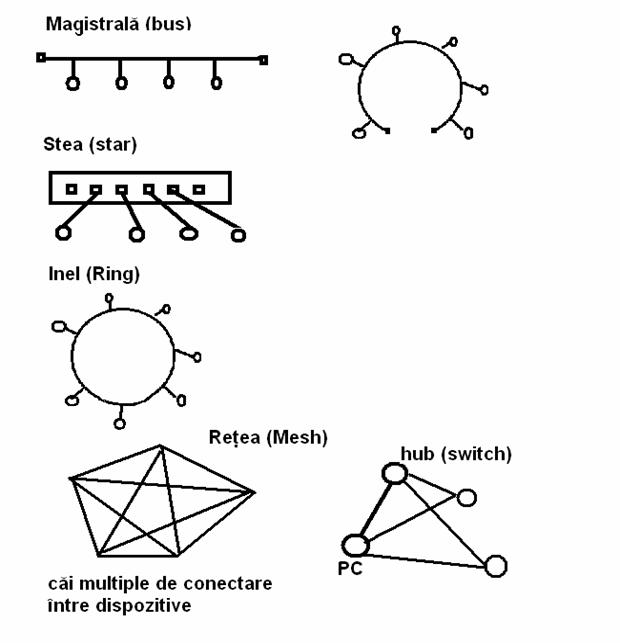 TOPOPLOGIE - amplasarea fizică a rețelei - modul de aranjare fizică a infrastructurii rețelei: calculatoare, dispozitive de conectare (punți, hub-uri, switch-uri), etc.
