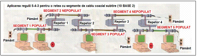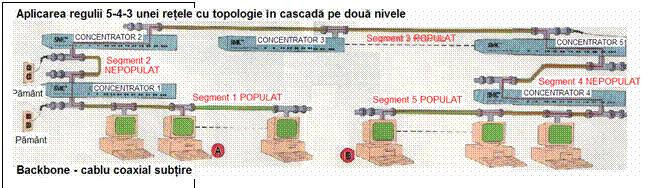 Pentru rețelele Ethernet 10 Base T și 10 BASE F , existența segmentelor populate și nepopulate își pierde semnificația, iar regula 5-4-3 devene regula 5-4: între 2 stații pot exista până la 5 segmente de legătură și 4 concentratoare. La toate rețelele cu cablu torsadat sau fibră optică, extinderea rețelei poate fi făcută prin legarea concentratoarelor în cascadă (2 nivele), fiecare cu topologie stea.