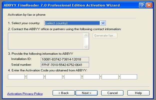 care se ia cate 5 cifre si se copiaza in caseta de dialog a programului la punctul 4 - "Enter Activation Code you obtained from ABBYY":