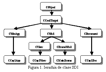 Structura de clase creata de AppWizard pentru o aplicatie SDI difera de cea creata pentru o aplicatie de tip Dialog. si în acest caz clasele vor deriva printr-un mecanism de mostenire simpla din clasa CObject, dar vor fi utilizate clase noi, care nu apar într-o aplicatie de tip Dialog.