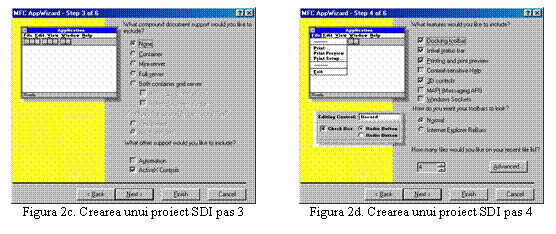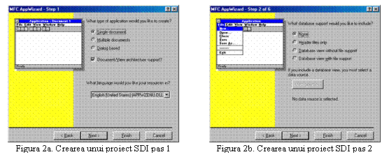 în caseta MFC AppWizard - Step1 se alege Single Document, cu optiunea Document View Architecture Support validata. Se apasa Next;