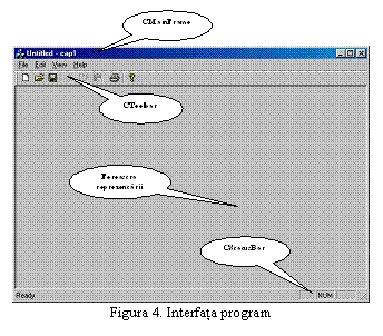 Clasa CMainFrame derivata din CFrameWnd furnizeaza aplicatiei o fereastra cadru în care sa ruleze. Spre deosebire de obiectele CFrameWnd care reprezinta ferestre simple, obiectele CMainFrame contin o serie de componente suplimentare, cum ar fi meniuri, bare cu instrumente, bare de stare, etc., care pot fi inserate si afisate în diferite forme, cu ajutorul unor indicatori de stil.
