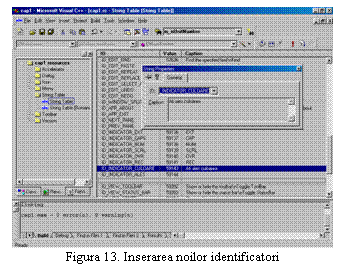 se selecteaza ultimul identificator din sectiune si se apasa tasta Insert pentru a insera un nou element în tabela de siruri. În caseta String Proprieties aparuta, se completeaza la ID: ID_INDICATOR_CULOARE si la Caption: Ati ales culoarea (fig. 13);