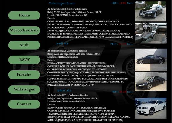 Site-ul contine date informative despre fiecare model pus spre vanzare structurate pe domenii specificate.Ele contin datele tehnice ale fiecarui model in parte, pretul precum si o poza sugestiva a masinii.
