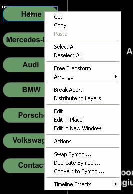 Au fost create mai intai 7 dreptunghiuri rotunjite in colturi cu x=45 de grade, urmand a fi introduce textele ce descriu actiunea lor. Folosind comanda Select All -> Convert to Symbol -> Ok. Astfel fiecare imagine creata cu dreptunghiul si text in interiorul sau a fost transformata intr-un buton.