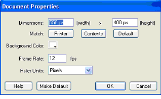 Configurarea scenei si a altor proprietati ale filmului se face din meniul Modify, optiunea Document (figura 3). Pot fi stabiliti parametri ca: