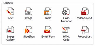 Paginile generate sunt indexate de catre motoarele de cautare. Programul va permite sa introduceti obiecte text, grafice, formulare (include formularele model gata pentru magazine online), un RSS, animatii audio si Flash. Cand introduceti un nou element, acesta poate fi prelucrat ulterior fara utilizarea unor instrumente suplimentare. Pentru a incepe sa folosim programul trebuie sa apasam butonul de START din dreapta de jos. Dupa ce apasam butonul, vom intra in program si vom putea sa ne incepem munca, dar in ordine. Pentru a fi siguri ca urmarim un plan, si ca munca noastra va fi simpla, va trebui sa respectam pasii oferiti de acest program. Acesti pasi ne sunt marcati de un meniu ce apare in stanga. `Acest meniu contine urmatoarele butoane: