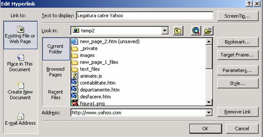Optiunea Display as Hyperlink se poate utiliza in cazul in care campul din baza de date contine un URL pe care vizitatorul va putea sa-l utilizeze. FrontPage va afisa un hyperlink care foloseste continutul campului atat pentru afisare cat si ca destinatie a hyperlink-ului. De exemplu, prin utilizarea unei tabele care are un camp care contine valoarea https://econ.unitbv.ro, prin utilizarea optiunii Display as Hyperlink se va crea urmatorul cod HTML pentru afisare: