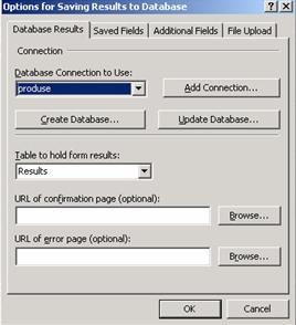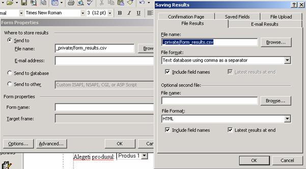 configurarea campurilor de salvat in tabela se poate face prin Saved Fields. Pentru fiecare camp se poate alege daca se salveaza in tabela si campul din tabela care sa contina datele din elementul respectiv al formularului. In cazul in care se doreste salvarea datelor dintr-un formular nou intr-o tabela deja existenta, campurile din formular trebuie corelate cu campurile tabelei. Daca nu se face aceasta corelatie, serverul de web care prelucreaza pagina nu va putea sa salveze datele.