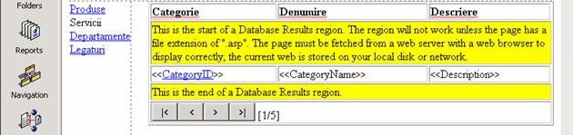 Prin apasarea butonului Finish, FrontPage va crea o pagina de web asemanatoare celei din figura urmatoare. Intreaga linie aflata sub antetul tabelului este afisata numai pentru a informa autorul ca pagini trebuie salvata cu extensie .asp si nu va aparea in browser. De asemenea, acelasi este si scopul pentru campul aflat imediat deasupra butoanelor de navigare. Pagina finala cu date se poate vedea numai in browser, FrontPage Preview afisand numai pagina salvata pe disc, neavand acces la facilitatile serverului de web.