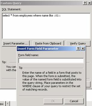 Optiunea Insert Parameter permite utilizarea unui camp din formular prin care se poate face filtrarea datelor in clauzele WHERE si HAVING ale comenzii SELECT. In urma executiei paginii si a trimiterii acesteia catre serverul de web, acesta va substitui valoare campului selectat in comanda SQL dupa care o va trimite spre executie in baza de date.