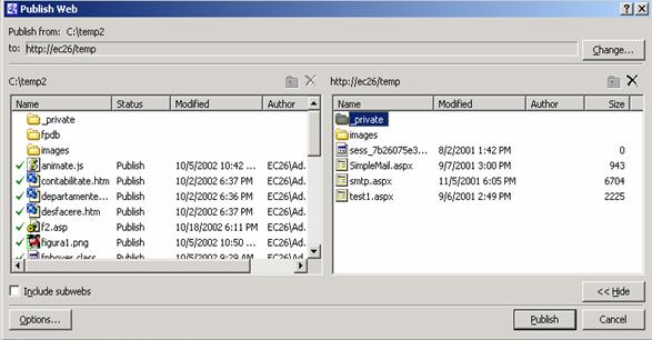 la aparitia casetei de dialog din figura urmatoare, site-ul web afisat in lista din stanga este pregatit de publicare in web-ul afisat in lista din dreapta. Locatiile From (sursa) si To (destinatie) apar deasupra fiecarei liste si sub bara de titlu.