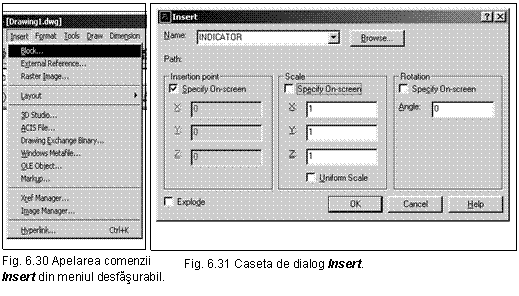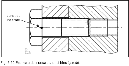 Blocurile se creaza cu scopul de a le insera (atasa) în alte desene deja create sau în lucru; de exemplu un bloc surub (fig. 6.23) se va insera într-un desen cu o gaura filetata (fig. 6.29), o carcasa se poate insera într-un desen de motor etc.