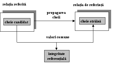 Valoarea unei chei straine reprezinta o referinta la tuplul a carui cheie are o valoare identica cu cea a cheii straine. Relatia care contine cheia straina poarta numele de relatie de referinta, iar relatia care contine cheia din care s-a propagat cheia straina se numeste relatie referita. Conditia de integritate referentiala cere ca toate valorile unei chei straine din relatia de referinta sa se regaseasca printre valorile cheii corespunzatoare (care s-a propagat) din relatia referita. Sensul propagarii este de la relatia referita la relatia de referinta; cheia straina prezenta în relatia de referinta provine din relatia referita (relatia de baza). Conditia de integritate referentiala introduce în baza de date niste constrângeri între relatii numite constrângeri referentiale. Figura 1.9 ilustreaza grafic principiul integritatii referentiale.