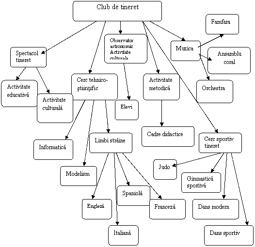 La un club de tineret, activitatile se desfasoara pe mai multe sectii: spectacole, cercuri tehnico-stiintifice, cercuri sportive, observatorul astronomic, muzica si activitati metodice.
