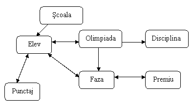 Relatiile dintre entitatile din modelul conceptual asociat scenariului descris sunt de tip (elevi-punctaj; premiu-punctaj; olimpiada-disciplina), 1: n (scoala-elev; olimpiada-faza) si n : m (elev-olimpiada; elev-faza; faza-premiu).
