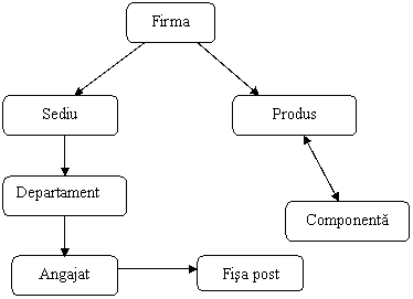 O firma are mai multe sedii. În fiecare sediu se afla mai multe departamente. Un departament apartine unui singur sediu. Într-un departament lucreaza mai multi angajati. Un angajat poate lucra într-un singur departamnet. Fiecare angajat are o singura fisa a postului unde sunt mentionate atributiile din timpul serviciului. Firma gestioneaza mai multe tipuri de produse si exista mai multe tipuri de componente; un produs este format dintr-una sau mai multe componente. Un tip de componenta poate sa apara în structura mai multor produse.