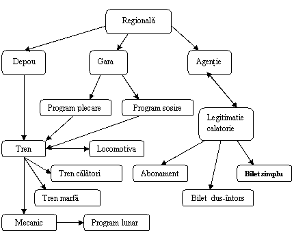 Reteaua de Cai Ferate din România are mai multe regionale. Fiecare regionala dispune de mai multe depouri, gari, agentii de vânzare bilete. Un depou poate fi pentru trenuri de marfa sau pentru trenuri de calatori. Un tren poate apartine unui singur depou si poate avea una sau mai multe locomotive. O locomotiva poate apartine unui singur tren la un moment dat. Un tren poate fi condus de unul sau mai multi mecanici dar un mecanic conduce doar un singur tren. Fiecare mecanic are un program lunar unic. O legitimatie de calatorie poate fi: abonament, bilet dus-întors sau bilet simplu si poate fi cumparata de la mai multe agentii. O agentie poate vinde mai multe legitimatii. Fiecare gara are un program de sosiri si plecari pentru fiecare tren în parte.
