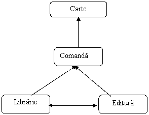 Relatiile dintre entitatile din modelul conceptual asociat scenariului descris sunt de tip 1 : n (librarie-comanda; editura-comanda; comanda-carte), iar relatia de tip n : m (librarie-editura) a fost rezolvata cu ajutorul entitatii de legatura comanda.