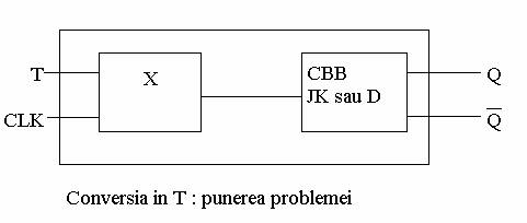 Pentru realizarea conversiei JK- T sau D T, trebuie gasita relatia dintre intrarea T a bistabilului simulate si intrarile JK sau D ale bistabilului disponibil.