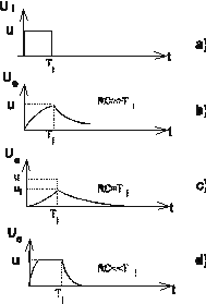 Aplicând la intrare un semnal impuls de durată Ti si perioadă de repetisie T, mai mare decât durata regimului tranzitoriu (figura 1.7a), răspunsul circuitului va fi dat de figura 1.7b, 7c si 7d, considerând toate cazurile relasionale între constanta de timp RC a circuitului si durata Ti a impulsului.