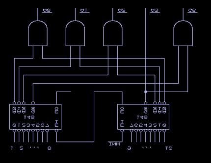Pentru realizarea unui decodificator binar 1 din 16 se pot folosi două circuite CDB 442 conectate ca decodificatoare 1 din 8 (figura 7.3).
