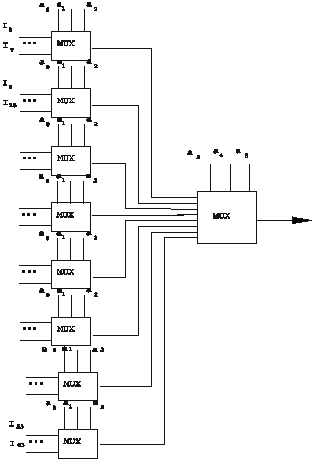Structura multidimensională poate fi utilizată si pentru a rezova problema inversă, aceea a selectării unei intrări. Pentru un selector de 64 intrări se poate utiliza o structură bidimensională ca în figura 7.7. Pe fiecare intersecsie x,y se conectează o poartă sI-NU cu colector în gol, cu două intrări pentru generarea pe y a semnalalor selectate prin decodificatorul pe x. Fiecărei