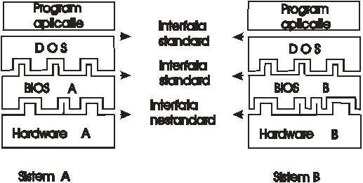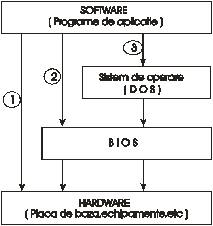 Astfel programul nu va scrie de exemplu direct īn circuitele cartelei video pentru afisarea unor caractere pe ecran maniera uzuala fiind aceea de a utiliza un intermediar care ofera servicii specializate. Acesti intermediari pot fi BIOS (Basic Input Output System) sau sistemul de operare (DOS-ul - Disk Operation System) care sunt interfete de programe (soft) create pentru a administra partea de echipament (hardware).