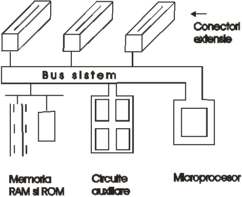 Acest bus exterior pe 8 biti de pe placa de baza (placa mama) lega microprocesorul ( P) de circuitele auxiliare de memorie si de placile de extensie aflate īn conectoare dupa cum se vede īn figura 2.3.