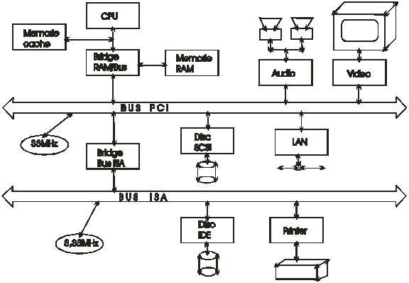 Busul PCI (Peripheral Component Interconnnected Bus) a reproiectat magistrala traditionala prin intercalarea unei alte magistrale īntre CPU si magistrala I/O existenta prin intermediul unor circuite bridge (punti) dupa cum se vede īn fig. 2.5. Aceasta magistrala este folosita si astazi īn majoritatea sistemelor PC motiv pentru care vom insista putin mai mult asupra caracteristicilor si posibilitatilor de transfer a acesteia . Firma Intel a proiectat īn 1990 aceasta magistrala si dupa ce a obtinut patentul, pentru a īncuraja folosirea ei a pus patentul īn domeniul public astfel ca proiectantii si companiile de calculatoare sa construiasca periferice pentru ea, fara sa plateasca drepturi de autor.