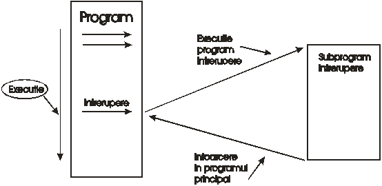 Pentru rezolvarea acestei probleme s-a ales o alta cale. Procesorul nu mai interogheaza perifericul ci tocmai perifericul este cel care semnalizeaza procesorului atunci cānd are de tratat o informatie. Acest mecanism se numeste īntrerupere hardware. Ca urmare, procesorul īsi īntrerupe programul īn curs de executie (fig. 2.6.) si declanseaza un program numit rutina de īntrerupere, aflata de obicei īn memoria BIOS si care are rolul de a rezolva cererea primita.