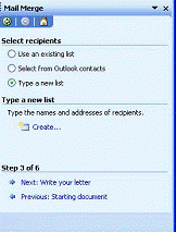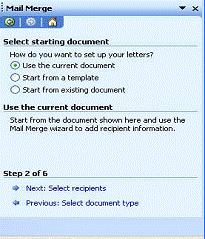 La meniul care apare se face clic pe tipul de document ce urmeaza a se crea: Form Letters (formular de scrisoare), Mailing Labels (etichete postale), Envelops (plicuri) sau Catalog (cataloage). La acest pas dupa ce se face selectia va aparea o caseta de dialog.