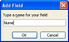 - Pt. adaugarea unui nume nou sau cīmp se introduce īn caseta Field Name si apoi se alege comanda Add Field Name. Daca butonul Add Field Name este gri, numele introdus este invalid. Un nume de cīmp trebuie sa īnceapa cu o litera ce poate fi urmata de litere, cifre sau caractere underscore (_); nu sunt permise spatii, iar numele nu poate depasi 40 de caractere īn lungime.