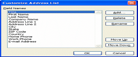 - Pt. schimbarea ordinii numelor de cīmpuri, se selecteaza un nume si se efectueaza clic pe unul din butoanele Move din dreptul casetei Field Name In Header Row pt. a cīmpul mai sus sau mai jos īn lista. Cu toate ca ordinea nu conteaza īn procesul de combinare, este bine sa avem īntrarile de date īn o ordine logica.