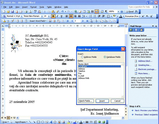 scrisorii si inserarea cāmpurilor dorite. Word permite introducerea