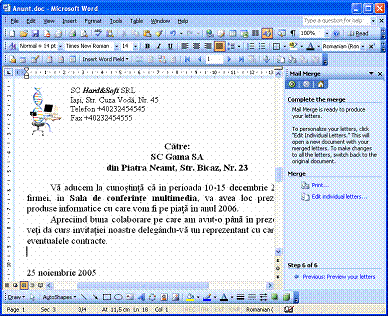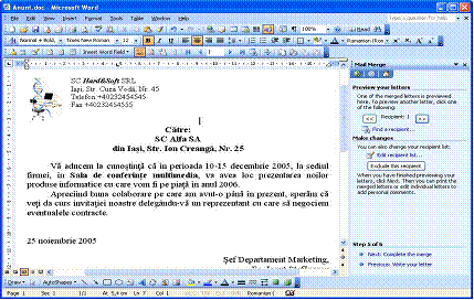 finalizarea procedurii de fuzionare a celor doua fisiere, scrisoarea si adresele destinatarilor.
