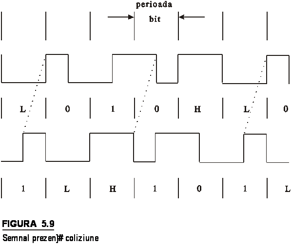 Detectarea coliziunii in HUB poate fi realizata printr-o logica numerica simpla (toate semnalele convergand catre acelasi punct). Semnalul prezenta coliziune este o secventa repetitiva de: 1 bit zero, 1/2 bit unu, 1 bit zero, 1 bit unu, 1/2 bit zero si 1 bit unu.