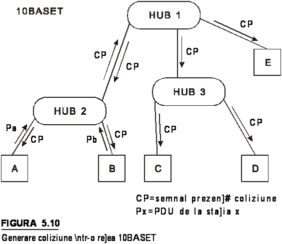 In figura 5.10 se prezinta o structura cu trei HUB-uri in care doua statii (A si B) incearca sa emita simultan.