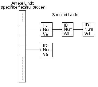 Situatii periculoase pot aparea atunci cānd un proces executa o operatie asupra unui semafor, probabil pentru blocarea unei resurse, si apoi īsi īncheie executia fara sa restabileasca valoarea initiala a semaforului. Astfel de situatii pot aparea ca rezultat al unei greseli de programare, sau ca rezultat al receptionarii unui semnal care determina īncheierea imediata a executiei unui proces. Daca, īn figura 10.14., procesul receptioneaza un semnal kill dupa decrementarea valorilor semafoarelor, el nu va mai putea sa le incrementeze din nou, deoarece semnalele kill nu pot fi tratate explicit sau ignorate. Īn consecinta, alte procese vor gasi semaforul blocat chiar daca procesul care a realizat blocarea nu mai exista. Pentru a evita asemenea probleme, un proces poate seta valoarea indicatorului SEM UNDO īn cadrul apelului sistem semop atunci cānd procesul īsi īncheie executia, nucleul inverseaza efectul fiecarei operatii cu semafoare pe care a facut-o procesul respectiv. Pentru a implementa aceasta facilitate, nucleul memoreaza o tabela care contine o intrare pentru fiecare proces din sistem. Fiecare intrare indica un set de structuri undo, cāte una pentru fiecare semafor folosit de catre proces (Figura 10.16.). Fiecare structura undo este o lista de tripleti care contin un identificator de semafor, un numar de semafor din setul determinat de identificatorul de semafor si o valoare de corectie.