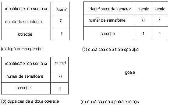 Figura 10.17 prezinta succesiunea evolutiei structurilor de tip undo īn cazul executiei programului cu parametrul 'a'. Dupa prima operatie, procesul contine o singura structura de tip undo corespunzatoare numarului de semafor 0 si valorii de corectie 1, iar dupa cea de-a doua operatie procesul contine si o doua structura corespunzatoare numarului de semafor 1 si valorii de corectie 1. Daca procesul si-ar īncheia executia īn acest moment, atunci nucleul ar parcurge fiecare structura, adaugānd valoarea 1 la fiecare semafor, readucāndu-le la valoarea la zero. Īn mod obisnuit, nucleul decrementeaza valoarea de corectie a semaforului 1 pe timpul celei de-a treia operatii, corespunzator cresterii valorii semaforului, si elimina structura, deoarece valoarea sa de corectie a devenit zero. Dupa cea de-a patra operatie, procesul nu mai contine nici o structura de tip undo, deoarece toate valorile de corectie vor fi zero.